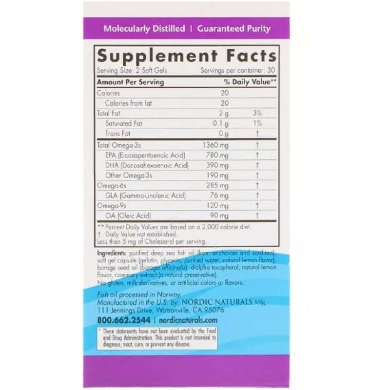 Формула от Nordic Naturals объединяет пищевые масла для создания сбалансированных пропорций жирных кислот Омега-3, Омега-6 и Омега-9. Омега-3, альфа-линоленовая кислота (ALA) и Омега-6, гамма-линоленовая кислота (GLA), играют важную роль в поддержании здоровой кожи и функции иммунной системы. Мононенасыщенная жирная кислота Омега-9, поддерживает здоровье сердечно-сосудистой системы.