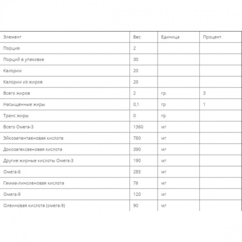 Очищенное глубоководное рыбье масло (из анчоусов и сардин), мягкая гелевая капсула (желатин, глицерин, вода, натуральный лимонный ароматизатор), масло семян боража (бораго лекарственный), d-альфа-токоферол, экстракт розмарина (натуральный консервант).