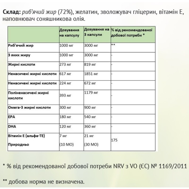 На каждую капсулу легкого для употребления рыбьего жира содержится 1 грамм продукта в котором 180 мг ЭРА (эйкозапентаеновой кислоты) и 120 мг DHA (докозагексаеновой кислоты). Для длительного хранения продукта и препятствию его окисающего добавлена натуральная форма витамина Е (альфа-токоферол ацетат).