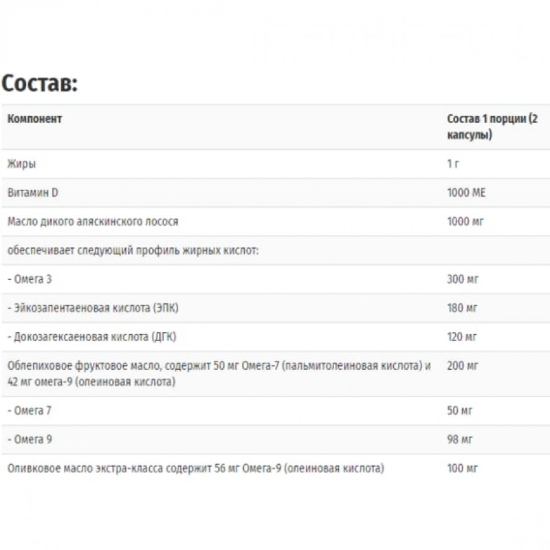 Желатин, глицерин, очищенная вода, сафлоровое масло. Содержит рыбу.