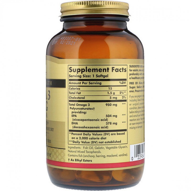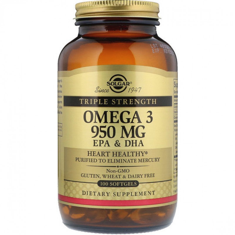 950 мг Омега-3 от Solgar обладает самой высокой концентрацией натуральных полиненасыщенных Омега-3 жирных кислот ЭПК и ДГК, полученных из обитающей в холодных водах рыбы. Данная формула укрепляет сердечно-сосудистую систему, суставы и кожу. Она подвергается молекулярной дистилляции для удаления ртути.