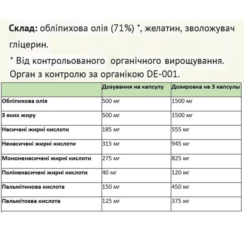 Сертифицированное органическое масло облепихи содержит калий, кальций, магний, железо, фолиевую кислоту, биотин и витамины С, B1, B2, B6, C, E и омега-3, омега-6, омега-7 и омега-9, положительно влияют на состояние сердца и сосудов.