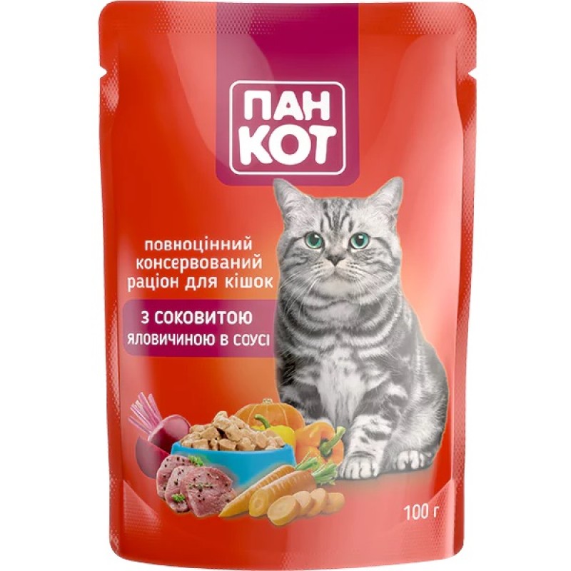 Пан Кот с сочной говядиной в соусе - полноценный консервированный корм для кошек