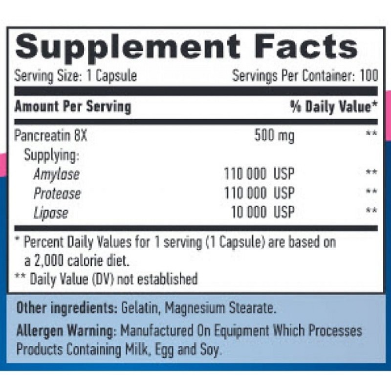 - Липаза в Super Pancreatin Enzymes представляет собой пищеварительный фермент, выделяемый поджелудочной железой, расположенной позади брюшной полости. Принимает участие в расщеплении жиров.