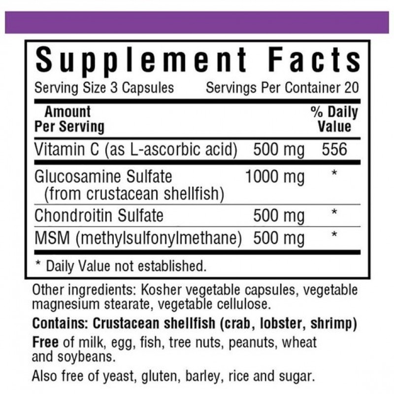 Продукт Bluebonnet's Glucosamine Chondroitin Sulfate Plus MSM Capsules представляет собой специальное сочетание чистого глюкозамина сульфата, хондроитина сульфата, OptiMSM и активной формы серы, а также витамина С, получаемого из L-аскорбиновой кислоты с отслеживаемым происхождением (IP). Доступен в удобных для глотания растительных капсулах, обеспечивающих максимальное усвоение и поглощение.