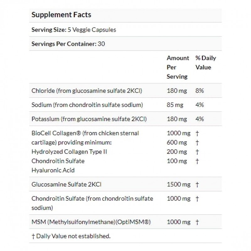 Хрящ, состоящий из протеогликанов, в основном расположен на костях и вблизи суставов и состоит в основном из коллагенового белка с боковыми цепями, называемыми хондроитинсульфатом. МСМ поставляет биодоступную серу, необходимую для здоровья суставов. BioCell Collagen-это проверенный диетический ингредиент, который содержит запатентованную композицию природного гидролизованного коллагена® типа II, хондроитинсульфата и гиалуроновой кислоты в высокоабсорбируемой матрице.