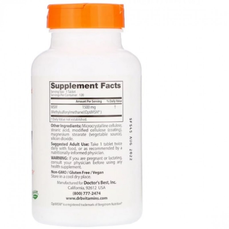 Doctor's Best MSM с OptiMSM содержит высококачественный очищенный МСМ (метилсульфонилметан), подтвержденный многочисленными клиническими исследованиями в отношении безопасности и эффективности. МСМ является природным соединением серы, которое помогает поддерживать формирование здоровых соединительных тканей. Это также помогает поддерживать общее здоровье суставов, мобильность и нормальный диапазон движений. Это также может помочь уменьшить окислительное повреждение, чтобы поддержать здоровую иммунную систему.