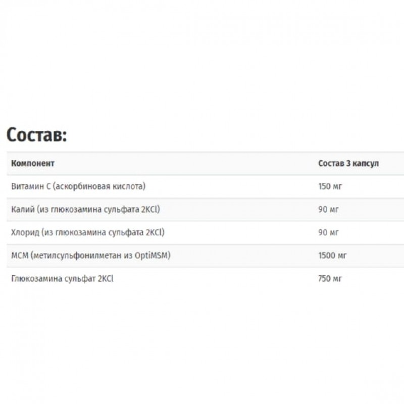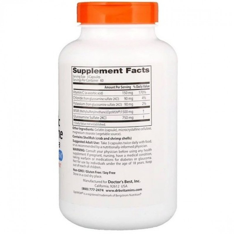 Формула Doctor's Best Глюкозамин МСМ (Glucosamine MSM) обеспечивает несколько строительных элементов для здоровья суставов. Глюкозамин сульфат улучшает структуру и работу суставов и обеспечивает их протеогликанами, улучшающими их здоровье, а также состояние соединительной ткани. Метилсульфонилметан (MSM, из OptiMSM) обеспечивает биодоступной серой, необходимой для суставов. Для обеспечения высокой чистоты и получения необходимой консистенции OptiMSM очищен путем дистилляции, что превращает его в прекрасный источник серы. Витамин C очень важен для выработки такого структурного протеина, как коллаген.