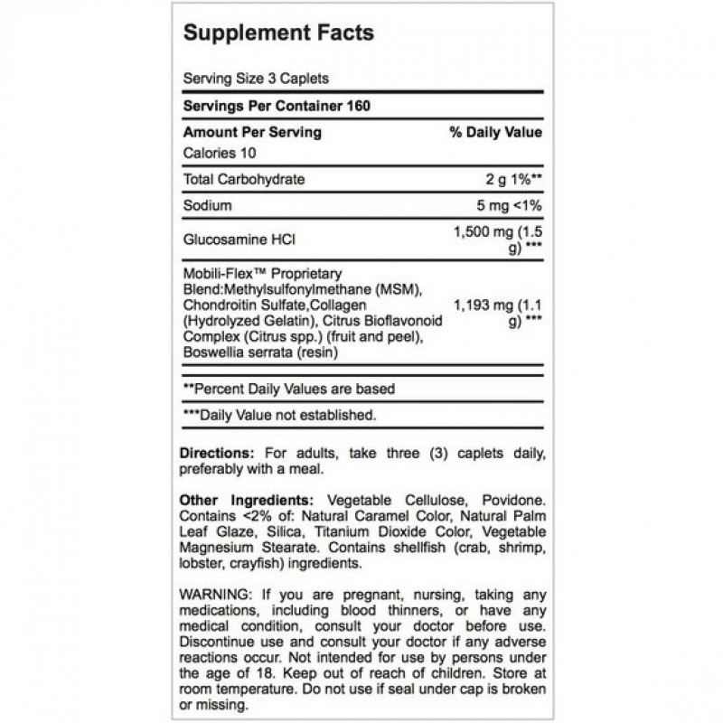 Патентованная формула Mobili-Flex™: метилсульфонилметан, хондроитин сульфат, коллаген (гидролизованный желатин), комплекс цитрусовых биофлавоноидов (из мякоти и кожуры), босвеллия пильчатая) — 1193 мг.
