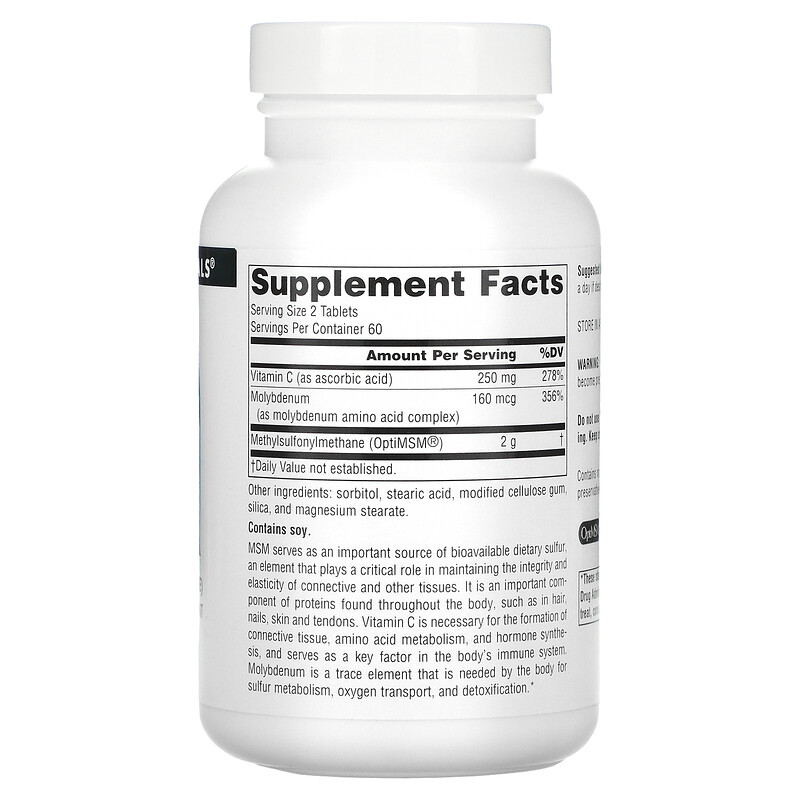 MSM служит важным источником биологически диетической серы, элемента, который играет важнейшую роль в сохранении целостности и эластичности соединительной и других тканей. Это важный компонент белков, обнаруженных во всем теле, например, в волосах, ногтях, коже и сухожилиях. Витамин С необходим для формирования соединительной ткани, обмена аминокислот и синтеза гормонов и служит в качестве ключевого фактора в иммунной системе организма. Молибден это микроэлемент, который необходим организму для метаболизма серы, транспорта кислорода и детоксикации.