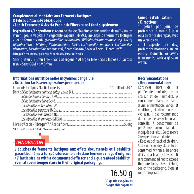 Ингредиенты: Основа: кукурузный крахмал, растительная капсула (HPMC), смесь лактоферментов (Lactobacillus acidophilus, Bifidobacterium animalis ssp. Lactis, Bifidobacterium longum, Bifidobacterium breve, Lactobacillus paracasei, Lactobacillus plantarum, Lactobacillus rhamnosus), волокна акации (FIBREGUM™).