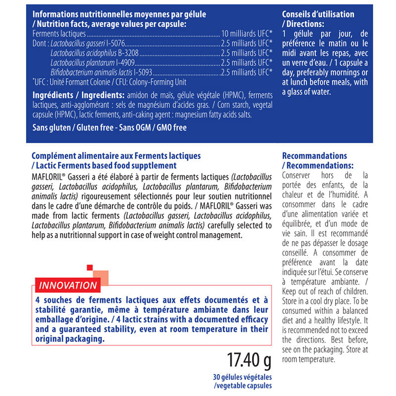 Синергетическая комбинация 4-х особых штаммов пробиотиков, включая Lactobacillus gasseri, Bifidobacterium animalis ssp. Lactis и Lactobacillus plantarum, MAFLORIL® Gasseri является эффективным препаратом в рамках диеты для похудения.