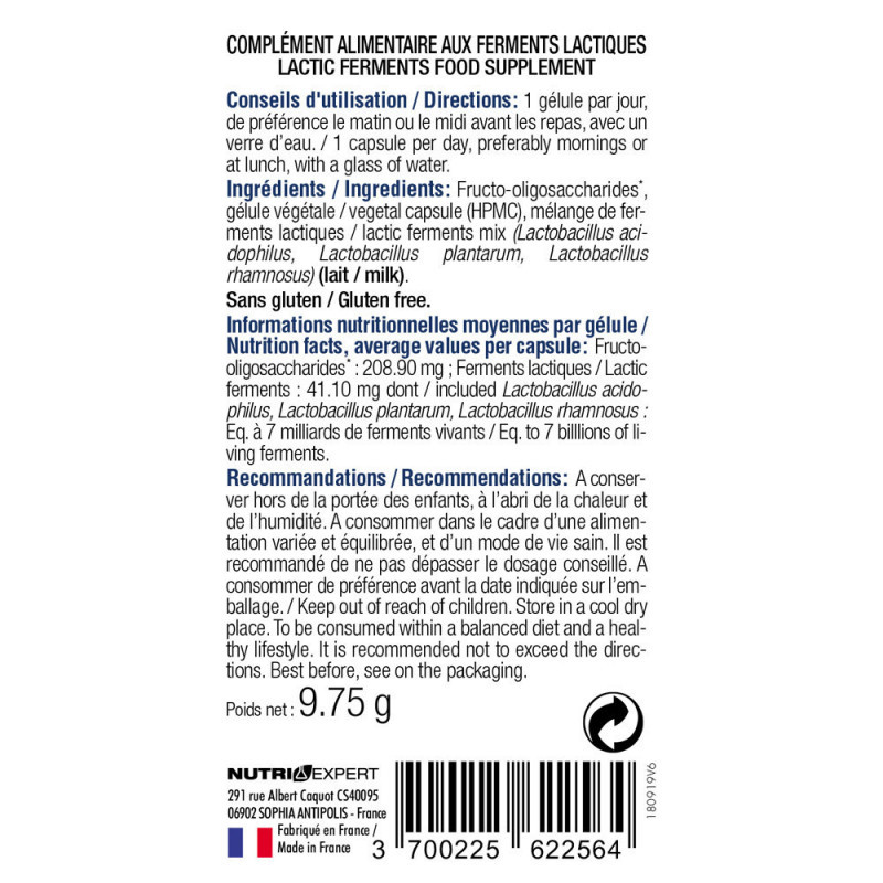 Ингредиенты: фруктоолигосахариды, растительная капсула (HPMC), смесь лактоферментов (Lactobacillus acidophilus, Lactobacillus plantarum, Lactobacillus rhamnosus) (молоко), эмульгатор: стеарат магния