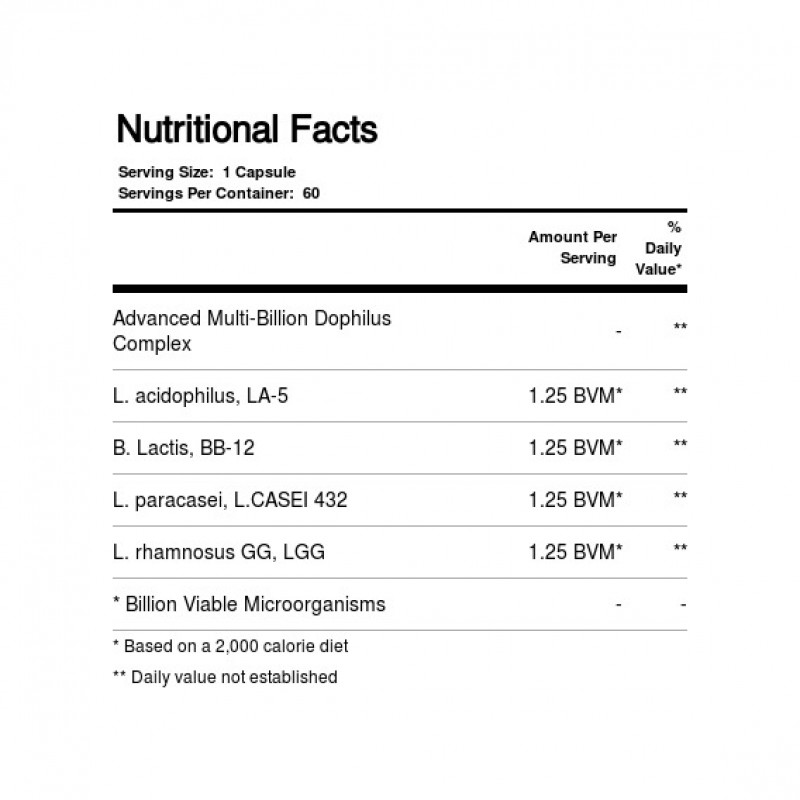 Усовершенствованные капсулы, содержащие миллиарды микроорганизмов Dophilus являются источником ацидофилуса (L. acidophilus), лактиса (B. lactis), параказеина (L. paracasei), рамнозы (L. rhamnosus GG) и других полезных микроорганизмов, которые помогают поддерживать здоровую кишечную флору. В состав данного продукта входят известные штаммы LA-5, BB-12, L. casei 431 и LGG, способствующие здоровому функционированию кишечной системы.