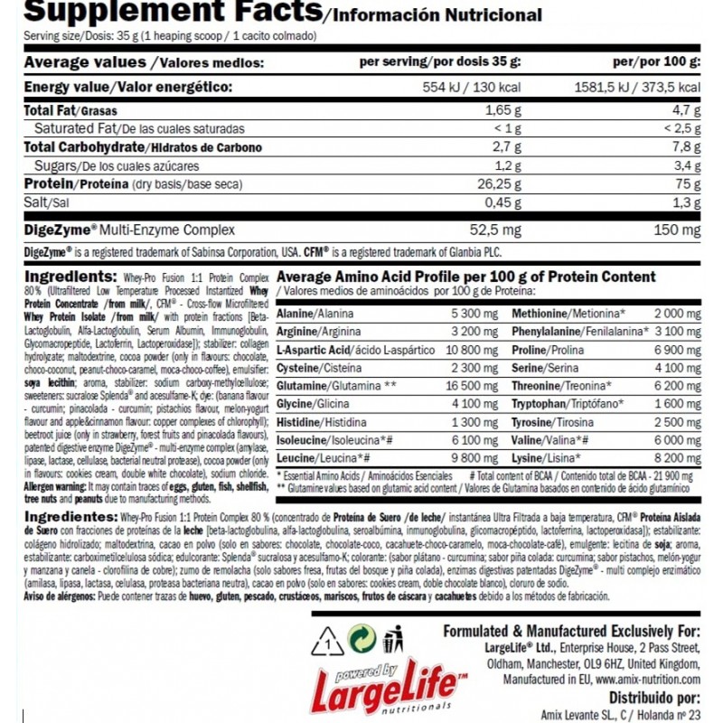 Ингредиенты:Whey-Pro Fusion 1:1 Protein Complex 80% (ультрафильтрованный низкотемпературный обработанный инстантизированный концентрат сывороточного протеина /из молока/, CFM® - микрофильтрованный сывороточный протеиновый изолят /из молока/ с белковыми фракциями [бета-лактоглобулин, альфа-лактоглобулин, сывороточный альбумин, иммуноглобулин, гликомакропептид, лактоферрин, лактопероксидаза]); стабилизатор: гидролизат коллагена, мальтодекстрин, какао-порошок (только во вкусах: шоколад, шоколад-кокос, арахис-шоко-карамель, мока-шоко-кофе); эмульгатор: соевый лецитин; ароматизатор, стабилизатор: карбоксиметилцеллюлоза натрий; подсластители: сукралоза Splenda® и ацесульфам-К; краситель: (аромат банана и пина колады – куркумин; яблоко и корица, дыня-йогурт и фисташки: медные комплексы хлорофилла), экстракт свеклы (только в ароматах клубники, лесных фруктов и пинаколады); запатентованный пищеварительный фермент DigeZyme® – мультиферментный комплекс (амилаза, липаза, лактаза, целлюлаза, бактериальная нейтральная протеаза); какао-порошок (только в ароматизаторах: печенье крем, двойной белый шоколад), хлорид натрия.