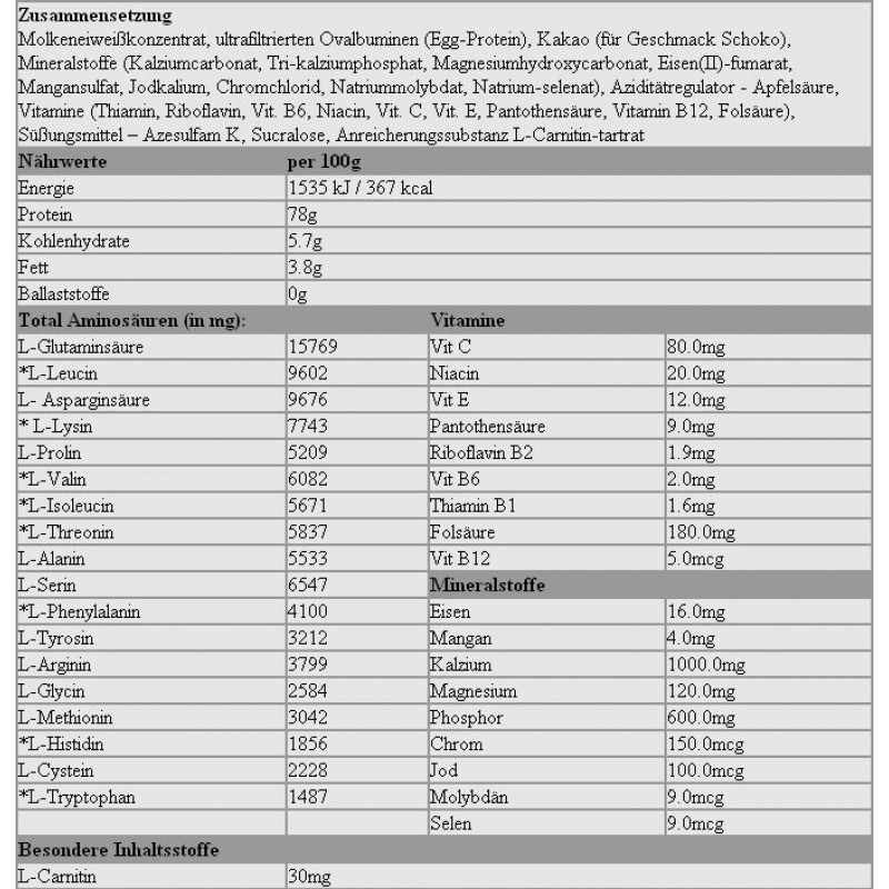 Состав: 97% белковая смесь (концентрат сывороточного белка (из молока), яичный белок ультрафильтрованный, протеин изолят сыворотки (из молока)), ароматы, регуляторы кислотности - лимонная кислота, яблочная кислота (для всех ароматов клубники), загустители - гуммиарабик ксантановую камедь, натрийкарбоксиметилцеллюлозу; подсластители - ацесульфам К, сукралоза, цикламаты; 0,04% L-карнитин-L-тартрат, 0,03% витаминов (L-аскорбиновая кислота - вит. С, DL-альфа-токоферилацетат - вит. Е, никотинамид - ниацин, D-биотин, ретинилацетат - вит .A, D-пантотенат кальция - пантотеновая кислота, гидрохлорид пиридоксина - вит. B6, холекальциферол - вит. D, птероилмоноглутаминовая кислота - фолат, тиаминмононитрат - вит. B1, рибофлавин - вит. B2, цианокобаламин - вит. B12), эмульгатор. - соевый лецитин; цвета: кармин (для всех вкусов: клубника, вишня, клубника-киви и банан-вишня), E 150c (для всех: печенье, сливки, ириска, шоколад, кофе, ледяной кофе, капучино, фундук и тирамису), рибофлавин , E 133 (для всех фисташковых вкусов).Изомальтулоза является источником глюкозы и фруктозы.
