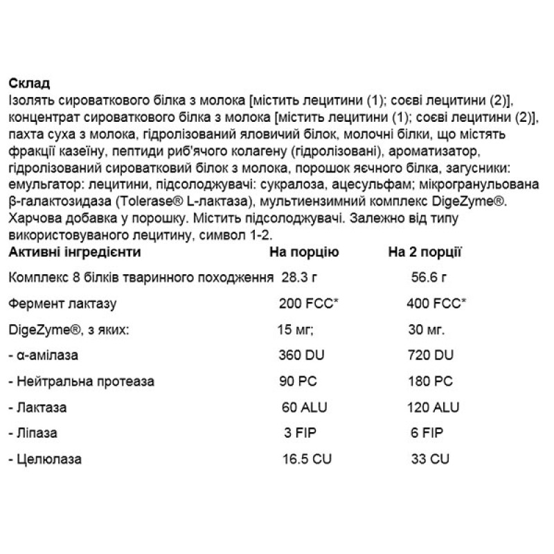 В препарате OstroVit присутствуют сывороточные белки, такие как концентрат сывороточного белка, изолят сывороточного белка или гидролизат сывороточного белка, а также гидролизованный говяжий белок, гидролизованные пептиды рыбьего коллагена, сухая пахта из молока и молочные белки. организм человека.