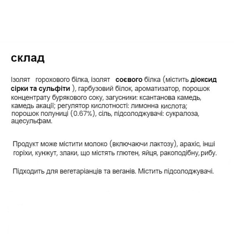Изолят горохового протеина, изолят соевого протеина (содержит диоксид серы и сульфиты), тыквенный протеин, какао 4,9%, натуральный шоколадный ароматизатор, загуститель: ксантановая камедь; соль, загуститель: гуммиарабик; подсластители: сукралоза, ацесульфам К.