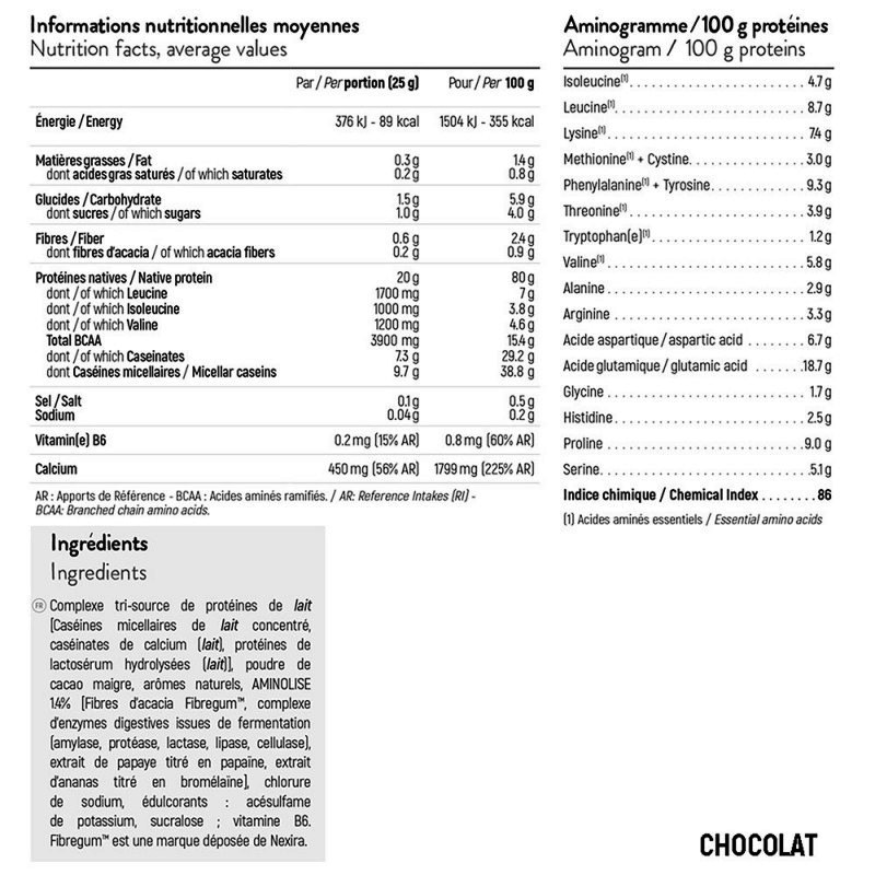 Ингредиенты: комплекс протеинов молока из 3-х источников (мицеллярный казеин из молочного концентрата, казеинат кальция (молоко), гидролизованный сывороточный протеин (молоко)), натуральный ароматизатор, AMINOLISE ® 1,4% (Fibergum™ волокна акации, комплекс пищеварительных ферментов полученный путем ферментации (амилаза, протеаза, лактаза, липаза, целлюлаза), экстракт папайи титрованный в папаин, экстракт ананаса титрованный в бромелаин), подсластители: ацесульфам калия, сукралоза; витамин В6.