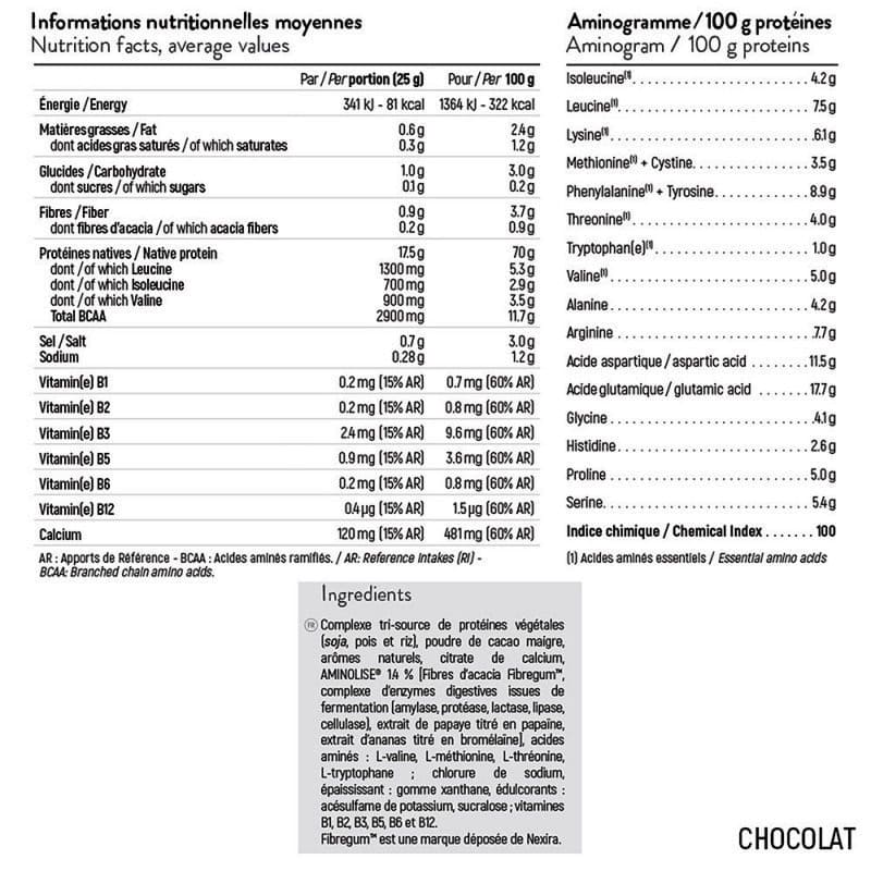 Ингредиенты: комплекс растительных протеинов из 3 источников (соя, горох и рис), обезжиренный какао-порошок (шоколад), натуральные ароматизаторы, мальтодекстрин (ваниль), цитрат кальция, AMINOLISE ® 1,4% (пребиотические волокна акации Fibregum™, комплекс пищеварительных ферментов полученный путем ферментации (амилаза, протеаза, лактаза, липаза, целлюлаза), экстракт папайи титрованный в папаин, экстракт ананаса титрованный в бромелаин), аминокислоты: L-валин, L-метионин, L-треонин, L-триптофан; хлорид натрия (шоколад), загуститель: гуаровая смола, подсластители: ацесульфам калия, сукралоза; витамины В1, В2, В3, В5, В6 и В12.