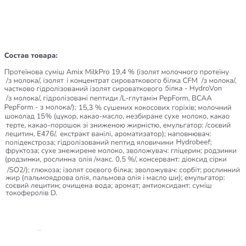 Exclusive Protein Bar это эксклюзивный протеиновый батончик, содержащий до 23 граммов запатентованного протеина MilkPro® Protein Blend отличного качества. MilkPro® Protein Blend содержит только запатентованное сырье - сывороточный изолят CFM®, концентрат и частично гидролизованный изолят HydroVon®. Кроме того, в составе находятся гидролизованные пептиды L-глютамин PepForm® и BCAA PepForm®. Exclusive Protein Bar обладает восхитительным вкусом и подходит как быстрый перекус.