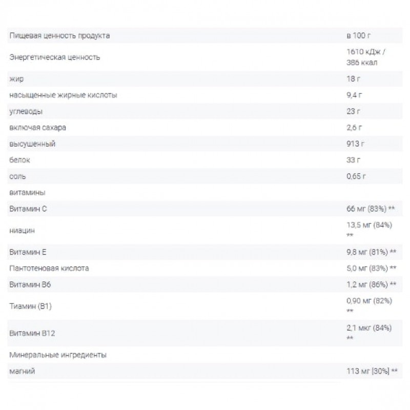 Высокое содержание магния, витаминов С и Е, ниацин, тиамин, витамин В6 и В12, пантотеновая кислота – и это всё в одном батончике!Отсутствие сахара (всего 1 грамм на баточник) и большое количество пищевых волокон – прекрасно станет частью Вашей сбалансированной диеты!