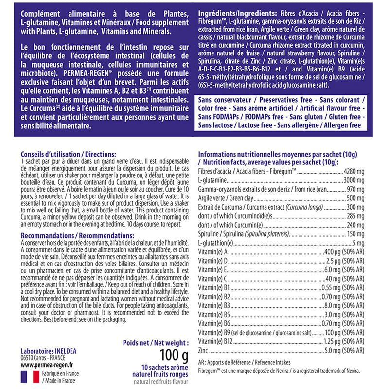 PERMEA-REGEN® также содержит волокна акации с высокой пищеварительной толерантностью (fibregum™) для поддержки микробиоты, зеленую глину и 3 г глутамина.