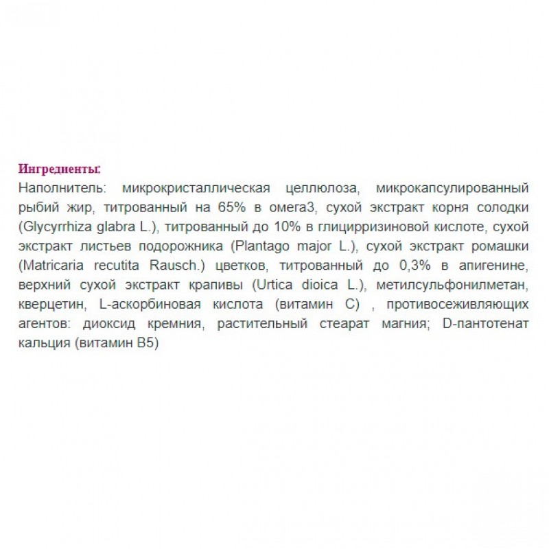 В состав Allergvin входят витамин С и экстракт листьев крапивы, способные защитить и поддержать иммунную систему; экстракт подорожника и ромашки успокаивающе действуют на слизистые оболочки, снижая воспаления; МСМ поможет вашей коже восстановиться после любой аллергической реакции; пантотеновая кислота или витамин В5 придаст энергии и сил, чтобы справится с любой аллергией.