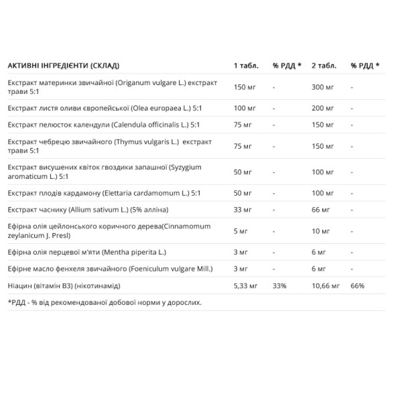 Экстракт чеснока (5% аллина) – противобактериальное, противовирусное, противогрибковое действие. Уничтожает в ЖКТ патогенные бактерии, не нарушая здоровой флоры, улучшает пищеварительные функции, моторику и перистальтику кишечника, предотвращает процессы брожения и гниения. Также укрепляет сердечно-сосудистую систему и влияет на поддержание иммунитета.
