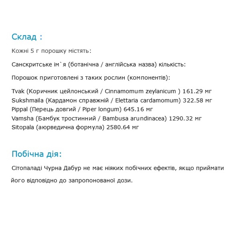 Ситопалади порошок Дабур изготовлена из многих аюрведических растений, главной из них это длинный перец, который является одним из лучших отхаркивающих средств существующих в природе.