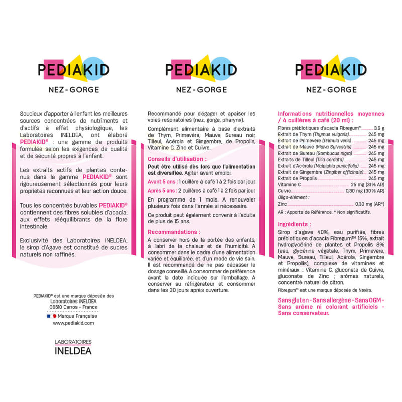 Он сочетает в себе многие растительные экстракты: чебреца, примулы, фиалки, черной бузины, липы, ацеролы, имбиря, прополиса, витамина С, цинку и меди. Экстракты чебреца, примулы вечерней и липы также известны своими успокоительными свойствами. Экстракты черной бузины и имбиря эффективны для освобождения дыхательных путей и обеспечивают комфорт вашего ребенка, а также известны своими иммуностимулирующие свойства. Экстракты помогают организму вашего ребенка побороть вредную влиянию окружающей среды (вирусы, бактерии). Продукт изготовлен с сиропом агавы, который придает сладости. Он является концентрированным источником питательных веществ и активных ингредиентов, которые имеют противовоспалительный, противоотечный эффект. Концентрат напитка pediakid содержит растворимые волокна, изготовленные из дерева акации, которые имеют благоприятный эффект на кишечную флору.