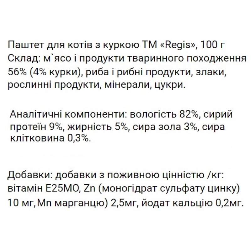 Влажный корм для кошек - паштет «Regis» с курицей, легче жевать, он лучше переваривается, идеально подходит для котят и взрослых кошек с чувствительным желудком или другими проблемами пищеварения. Когда вы кормите своего питомца здоровым, питательным влажным кормом, вы учитываете его диетические и натуральные потребности, поддерживаете здоровое пищеварение и качество шерсти, здоровья сердца, глаз и других органов.