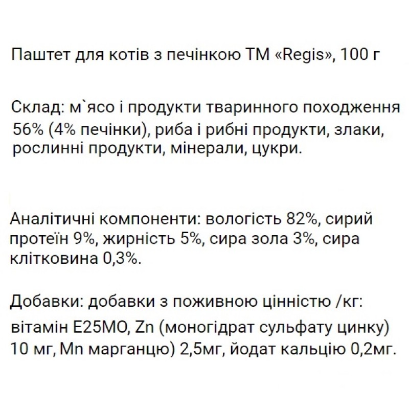 Влажный корм для кошек - паштет «Regis» с печенью , легче жевать, он лучше переваривается, идеально подходит для котят и взрослых кошек с чувствительным желудком или другими проблемами пищеварения. Когда вы кормите своего питомца здоровым, питательным влажным кормом, вы учитываете его диетические и натуральные потребности, поддерживаете здоровое пищеварение и качество шерсти, здоровья сердца, глаз и других органов.