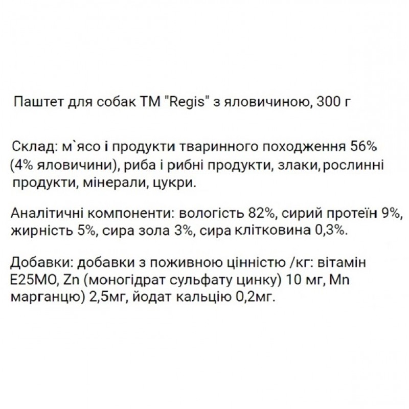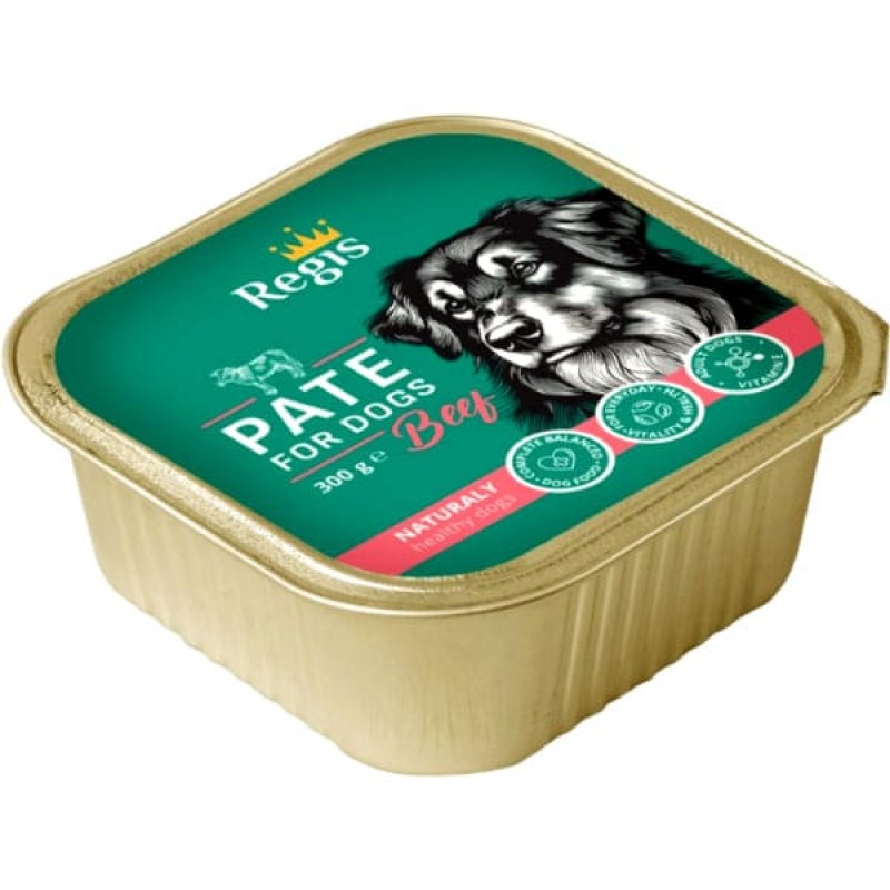 Паштеты "Regis" с говядиной — это разновидность влажного корма. Паштет представляет собой мясную массу, обработанную для создания нежной и мягкой текстуры. В отличие от консервированного корма паштеты с говядиной имеют более гладкую консистенцию, что делает их легко усваиваемыми для собак.