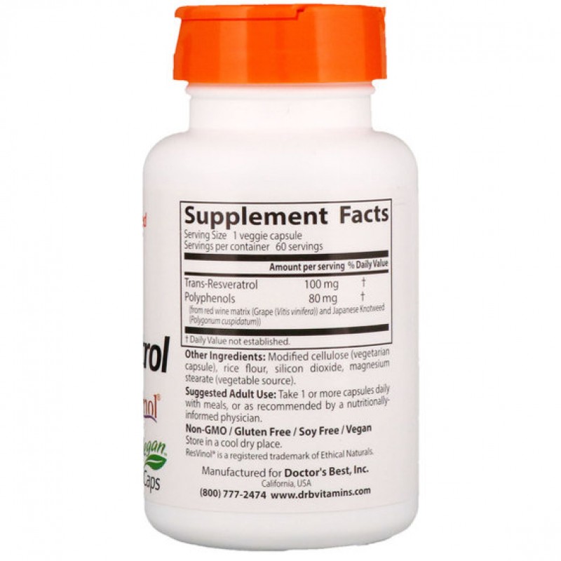 Ресвератрол – самый мощный антиоксидант из известных сегодня медицине. Эффективная профилактика новообразований. Ученые доказали, что прием ресвератрола активизирует в организме человека ферменты, которые влияют на гены старения. Сегодня широко известно, что он стимулирует мозговую деятельность, улучшая концентрацию внимания и память, препятствует окислению холестерина, в разы снижает риск развития инсультов, инфарктов и атеросклероза. Вегетарианская формула. GMP гарантированное качество.