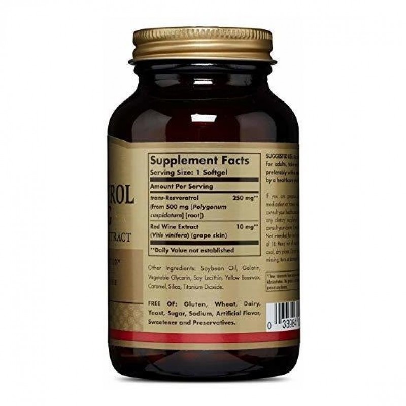 Ресвератрол — это натуральный полифенол, который содержится в красном вине, арахисе и некоторых растениях, в том числе в траве Polygonum cuspidatum. Это небольшая молекула, относящаяся к категории стильбенлов. Полифенолы, такие как ресвератрол, обладают мощными антиоксидантными свойствами, помогающими бороться в организме со свободными радикалами, повреждающими клетки и вызывающими оксидативный стресс. В свою очередь, данный стресс может способствовать преждевременному старению клеток. Каждая мягкая желатиновая капсула содержит больше ресвератрола, чем обычная бутылка красного вина.