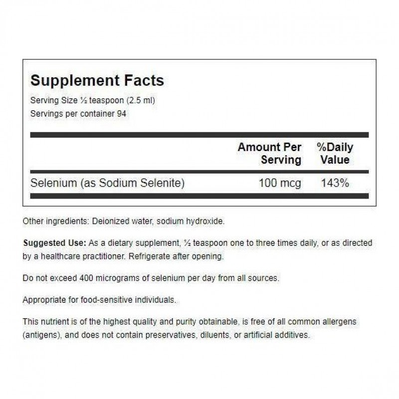 Селен (Selenium Solution) - это чистый гипоаллергенный раствор селенита натрия. Ежедневное потребление натрия в селените натрия обладает незначительной питательной ценностью.
