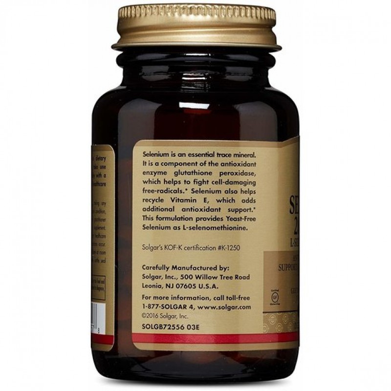 Селен является незаменимым микроэлементом. Он является компонентом антиоксидантного фермента глютатионпероксидазы, который помогает бороться со свободными радикалами, повреждающими клетки. Селен также помогает переработать витамин Е, который добавляет дополнительную антиоксидантную поддержку. Это также необходимо для метаболизма гормонов щитовидной железы и здорового метаболизма гормонов щитовидной железы и здоровой функции щитовидной железы. Этот состав обеспечивает селен без дрожжей в виде L-селенометионина.