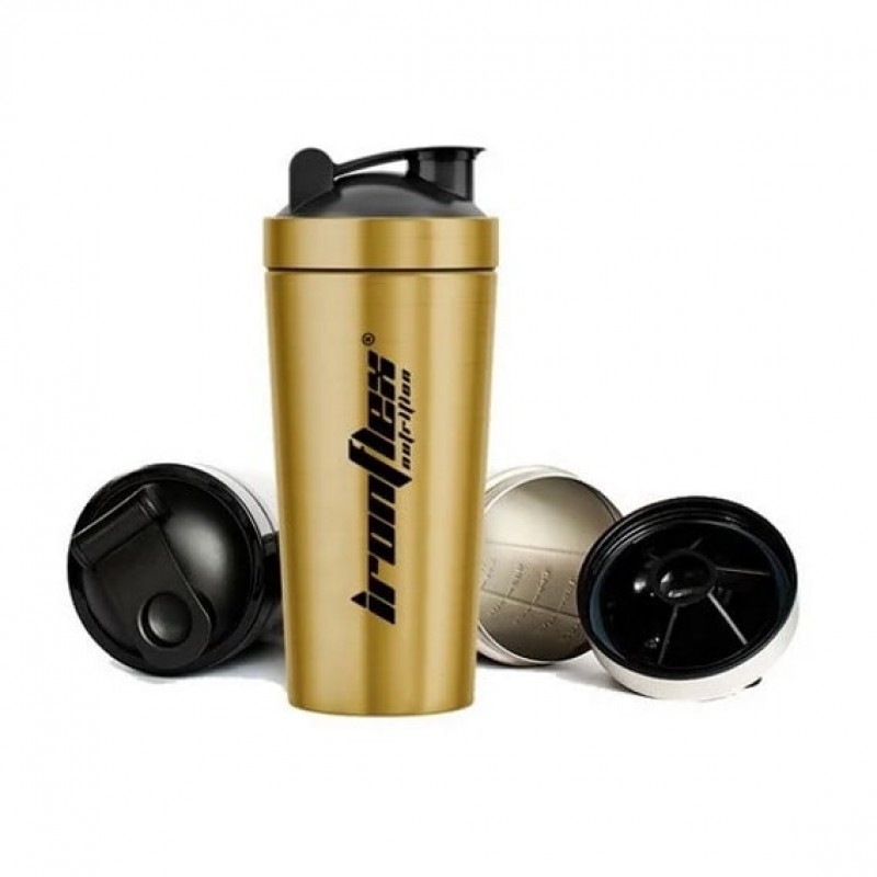 IronFlex металлический изготовлен из высококачественной пищевой нержавеющей стали, имеет элегантный дизайн стильный золотой цвет. Stainless Steel Shaker промаркирован на 750 мл (25 унций), но он вмещает до 900 мл (30 унций), отметки уровня жидкости нанесены на матовую поверхность. Ситечко для смешивания встроено в крышку и имеет силиконовый уплотнитель.