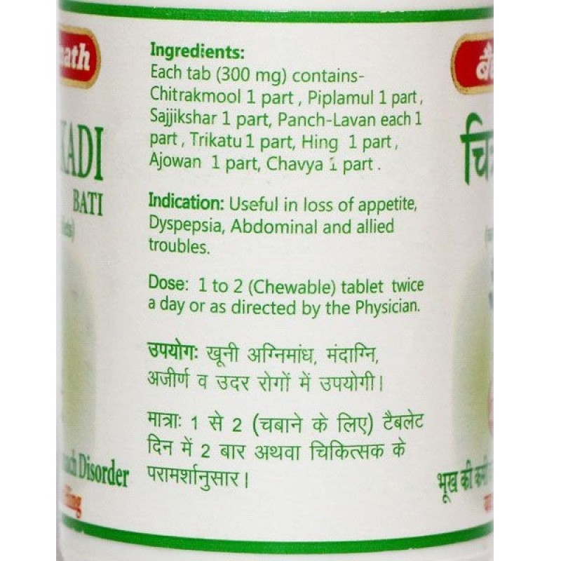 Chitrakadi Bati Baidyanath – неотъемлемая часть Панчакармы. Он может уравновесить три доши за счет улучшения функции питты. Он не рекомендуется людям с гастритом, и он может содержать соль в качестве ингредиента. Поэтому его не следует давать пациентам с гипертонией.