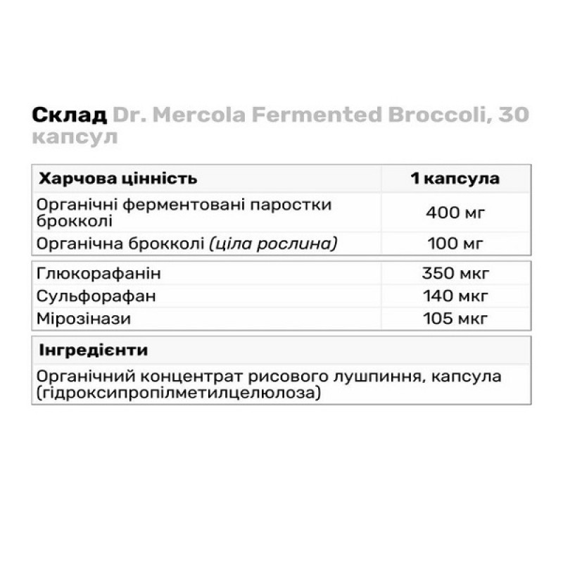 Основным ингредиентом брокколи является сульфорафан - мощный антиоксидант с многочисленными свойствами. Брокколи в этом продукте прошел процесс преобразования с помощью фермента, называемого мирозиназой. Процесс ферментации способствует лучшему усвоению питательных веществ и обеспечивает надежный, жизнеспособный источник сульфорафана. Он поддерживает здоровье клеток, процессы детоксикации организма, здоровые уровни холестерина и обеспечивает здоровье кишечника за счет поддержки микрофлоры. Ферментированная брокколи может поддерживать самые разнообразные показатели здоровья, улучшая общее самочувствие.