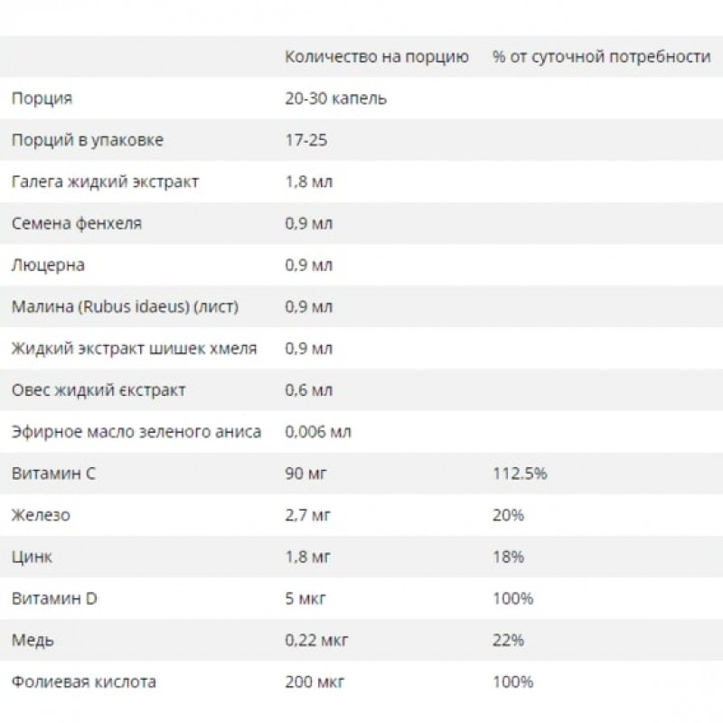 Анис способствует секреции молока у кормящих женщин, повышает аппетит, лечит респираторные заболевания, заболевания желчного пузыря и печени. Источником питательных веществ в комплексе является овес, он помогает поддерживать здоровую нервную систему и избавляет от бессонницы. Необходим для поддержания здоровой гормональной системы, способствует стимуляции и развитию молочных желез. Витамины и минералы в составе необходимы женщинам во время беременности и кормления грудью, а также ребенку, который получает полезные вещества с молоком матери.
