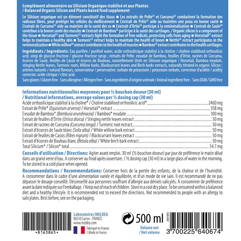 Ингредиенты: очищенная вода, холин-стабилизированная ортокремниевая кислота, глюкозно-фруктозный сироп; экстракты хвоща, экссудата бамбука табашир, молодых побегов бамбука, листа крапивы, корня куркумы, коры ивы белой, листа черной смородины, коры березы белой, природно богатые органическим кремнием (основа: мальтодекстрин, гуммиарабик); натуральные аромы малины и лимона (основа: пропилен гликоль), консерванты: сорбат калия, бензоат натрия; регулятор кислотности: лимонная кислота.