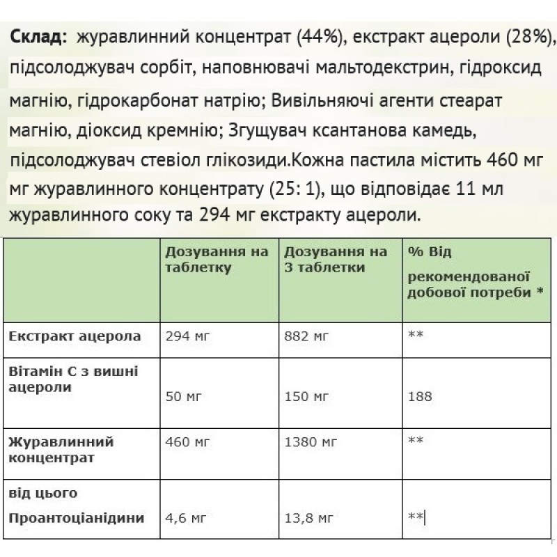 Пастилки ацеролы и клюквы - благодаря высокому содержанию проантоцианидины и витамина С, рекомендуется при острых и рецидивирующих инфекциях мочевых путей и для профилактики рецидивов.