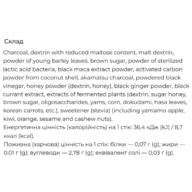 В составе присутствует сразу несколько видов угля, что значительно повышает действенность средства: бамбуковый уголь, активированный уголь скорлупы кокосового ореха, древесный уголь Ина-акаматсу, активированный уголь кишу банчотан. Древесный уголь очищает кишечник, значительно улучшает и ускоряет процессы пищеварения, способствует снижению избыточного веса, способен абсорбировать и выводить из организма токсичные вещества, газообразные соединения и соли тяжелых металлов.