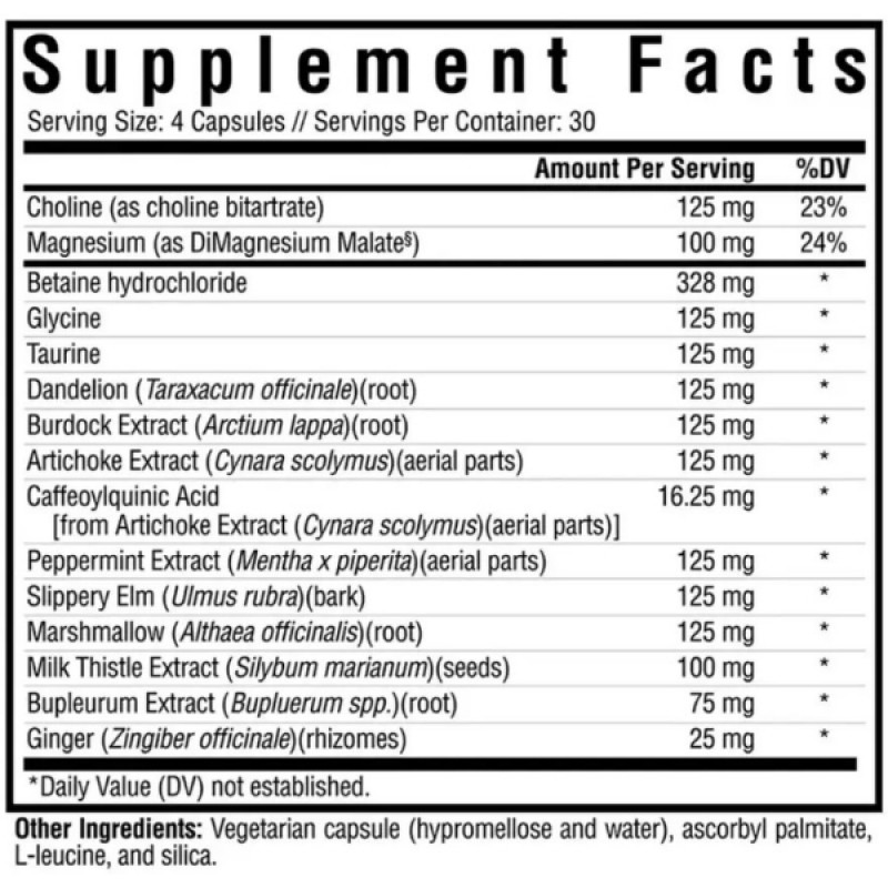 Этот комплекс поддерживает переваривание жирной пищи, выработку желчи и здоровую работу желчного пузыря и печени. Он сочетает в себе питательные строительные блоки и уникальную смесь травяных ферментов и фосфатидилхолинов для создания сбалансированной растительной формулы для здоровой функции желчного пузыря. Питательные вещества, как холин, таурин и глицин, помогают производить достаточное количество желчи. А такие растительные составляющие, как экстракт артишока, лопуха и одуванчика стимулируют сокращение желчного пузыря и отток желчи из желчного пузыря, когда это необходимо. Расторопша (силимарин) является одним из наиболее распространенных растений в лечении и профилактике заболеваний печени, желчного пузыря и кишечника. Растительные компоненты стимулируют выработку желчи, которая поддерживает здоровый баланс микробов в тонком кишечнике, успокаивают тонкую кишку. Смягчающие травы, скользкий вяз и алтей помогают поддерживать гладкую слизистую оболочку кишечника и своими растворимыми волокнами помогают в нормальном связывании избыточного холестерина. Бетаин, имбирь и мята обеспечивают поддержку пищеварительной системы. С этим комплексом вы можете получить пользу от питательных веществ, которые способствуют здоровому пищеварению и здоровому функционированию всего организма.