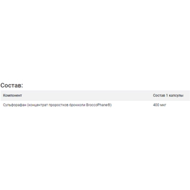 - Сульфорафан (концентрат проростков брокколи BroccoPhane®): 400 мкг