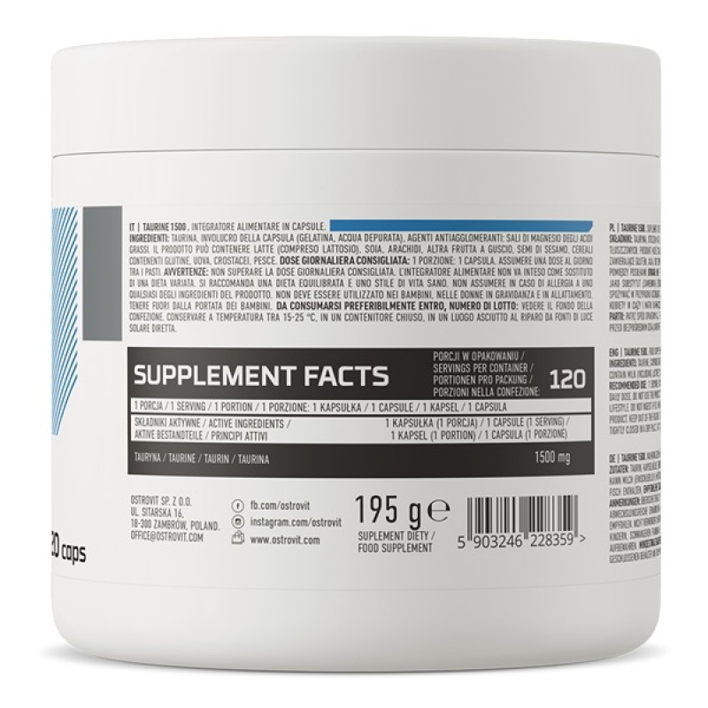 OstroVit Taurine 1500 — ударная доза таурина в форме удобных капсул. Эта аминокислота повышает выносливость и работоспособность, уменьшает усталость, помогает бороться со свободными радикалами, а также нормализует уровень глюкозы в крови. Добавка подходит всем физически активным людям и спортсменам любого уровня подготовки.