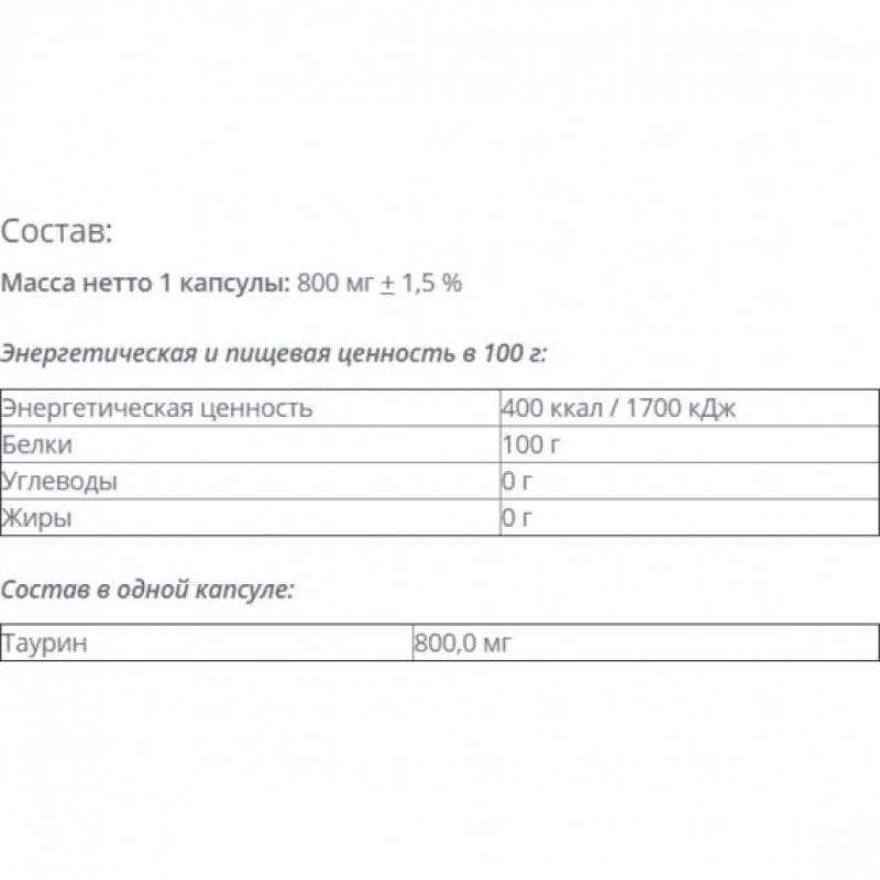 Вещество необходимо для нормального обмена натрия, калия, кальция и магния. Стоит учесть, что если принимать Taurine перерывом не более 6 часов между приемами, то вещество способно снижать аппетит.