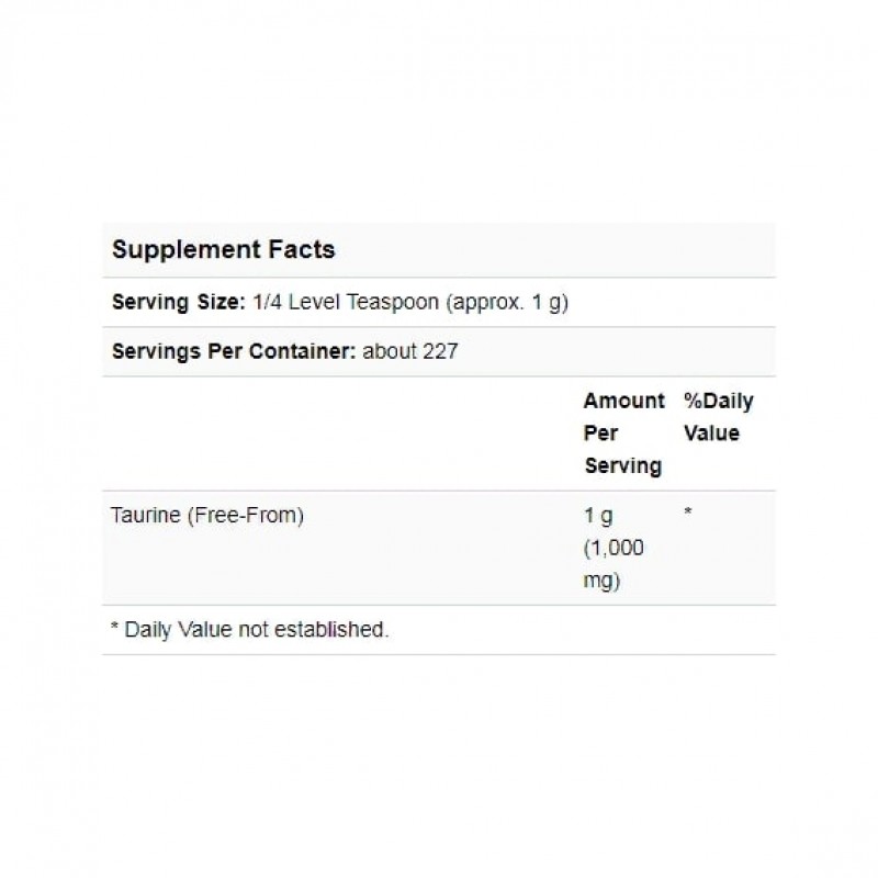 Таурин — условно незаменимая аминокислота, которая не используется для синтеза белка, однако главным образом обнаруживается в свободной форме в большинстве тканей, особенно в нервной системе. Этот элемент стабилизирует клеточные мембраны тканей, облегчая процесс перемещения калия, натрия, кальция и магния в клетках и за их пределами. Таурин способствует генерации и регуляции нервных импульсов, а также обеспечивает поддержку нормального водного баланса. Кроме того, эта аминокислота используется в зрительных путях, а также в мозговой и нервной системах, где совместно с глицином и ГАМК выступает в роли нейромедиатора.
